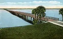 The original Edison Bridge was built to carry the Tamiami Trail, which had previously crossed the river on a narrow wooden bridge upstream that opened on March 12, 1924. This bridge was located in East Fort Myers at Freemont Street and connected to what is today known as Old Bridge Road in North Fort Myers.[4] Construction of the bridge at Freemont Street was initially started by a private company with the intention of making it a toll bridge. Lee County planned to initially use the bridge at Freemont Street for its portion of the planned Tamiami Trail, but the federal government would not designate it as part of a U.S. Highway if the bridge had a toll. So, the county purchased the bridge and completed its construction.[5]