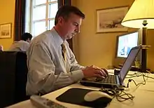 In 2003, Gillespie was selected as Chairman of the RNC, serving in that role through the 2004 elections that saw President Bush win re-election and Republicans retain control of the House and Senate.[13] He did not give up his stake in the lobbying firm when he took that job, which caused controversy.[12] During the campaign, he was regularly referred to as "President Bush's pit bull."[21] In 2005 Bush appointed Gillespie to lead the process to nominate a successor to Sandra Day O'Connor on the Supreme Court; that process led to the selection and confirmation of Samuel Alito.[22][23][24]