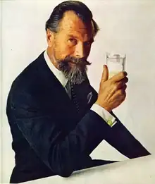 In 1947, Whitehead was an economic advisor to Sir Stafford Cripps (then Chancellor of the Exchequer), working on training and productivity in British industry. He joined Schweppes in 1950, being responsible for foreign expansion. In 1953, he was made president of Schweppe's American operations,[2] in the same year catching the eye of adman David Ogilvy, who was creating advertising for Schweppes. Schweppes had until 1952 been imported from Britain, and was thus an expensive niche product. In 1952 an agreement was signed with Pepsi to bottle Schweppes in America, allowing the price to be cut in half. Ogilvy's remit was to convince Americans that the lowering of price was not accompanied by a lowering of quality.[3] Ogilvy had just recently created the "Hathaway Man" character for C.F. Hathaway Company, featuring Baron George Wrangell as a sophisticated and talented figure with a mysterious eyepatch[4] and convinced Whitehead (who was at first reluctant)[3] to become an icon with similar snob appeal for Schweppes.[5][1]