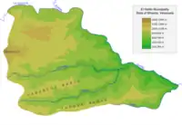 La Guairita stream flows into the Guaire in northeastern El Hatillo. The Guaire river is the eastern limit of the municipality, separating it from Sucre and Paz Castillo in the southeastern sector of El Hatillo. La Guairita serves as the northern boundary between El Hatillo and the municipalities of Baruta and Sucre. Limiting Baruta to the west, the boundaries of the municipality follow El Volcán, Pariaguán, La Mata and other peaks until they meet Turgua range in southeastern El Hatillo.[16][17]