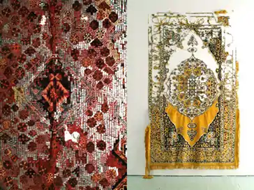 Herzog expanded her themes and formal ambitions in four subsequent installations. At the outset of the U.S. War in Iraq, she turned to more specific cultural referents—Persian-style carpets deconstructed to the point of dissolution—in order to convey powerlessness, fragility, the fluidity of cultural meaning, and global power dynamics for Civilization and Its DisContents (Smack Mellon, 2003).[42][11] At the Herbert F. Johnson Museum (2006), she reconfigured that work alongside carpets and art from the museum's own collection to further those themes.[17] W(e)ave (2007, Aldrich Museum, with sound artist Michael Schumacher) and Plaid (2007, Smack Mellon) signaled Herzog's growing architectural and spatial engagement. W(e)ave featured lacy white bedspread fragments embedded on custom-built walls; Nancy Princethal wrote that the ghostly floral fragments suggested faded memories of the one-time 18th-century residence's eroded decorative motifs.[2] In Plaid, Herzog shifted from pictorial formats to bolder sculptural configurations of built structures and surfaces seemingly invaded by patches or shifting three-dimensional grids of stapled brown wool.[20][43][12]