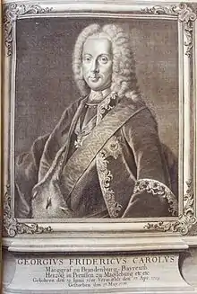 | George Frederick Charles | ![]() | 30 June 1688 | 1726–1735 | 17 May 1735 | Margraviate of Brandenburg-Bayreuth | Princess Dorothea of Schleswig-Holstein-Sonderburg-Beck 17 April 1709 Reinfeld five children | |