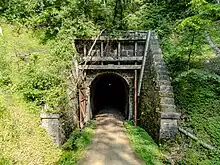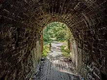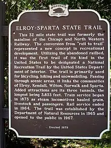 The Elroy-Sparta State Trail is a 32.5-mile (52.3 km) Wisconsin State rail trail between Elroy and Sparta, Wisconsin. Considered to be the first rail trail when it opened in 1967, it was designed for foot, bicycle, equestrian and light motorized traffic. Designated a multi-use trail, it offers recreational access to the routes and is open to the public.[2] The trail is part of the larger Wisconsin bike trail system operated by the state of Wisconsin.[3] It passes through rural scenery and three tunnels.[4] It is one of six connecting trails in west-central Wisconsin. It was added to the Rails-to-Trails Conservancy hall of Fame in September 2008.[5] It is one of the most popular trails in Wisconsin.[6]