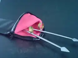 A pair of Emei piercers or emeici in a soft case for carrying.