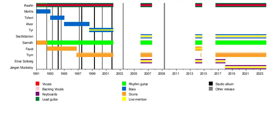 Emperor is a Norwegian black metal band formed in 1991, regarded as highly influential by critics and emerging black metal bands.[2][3][4] The group split up in 2001, but reunited from 2005 to 2007 for a few festival dates and brief US tours, and again reunited in 2013 to 2014. Emperor reformed for the third time in 2016. The group was founded by Ihsahn (guitar/vocal) and Samoth (then, drums).