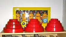 Energy domes sold through Club Devo have come in several forms. The original Club Devo domes were of a smaller size than the stage-worn domes, with raised "DEVO" text on the top and a lip around the edge.[6] This same mold was used again in 2005 for mass-produced energy domes sold as Halloween costumes.[7] In 1996, Devo sold new energy domes that roughly matched the stage-worn model, though the new stage domes were slightly smaller than the original. The first versions of these domes were made of white plastic, spray-painted red.[8] These were later replaced with domes made in a solid red plastic in 2004, manufactured by Chaser Shirts. In 2005, NECA Collectibles began manufacturing energy domes for Devo out of thin, off-color plastic.[9] These were used until 2008 when a fan began custom manufacturing domes out of thick, red plastic for the band.[10] The new domes revert to the dimensions of the original stage energy domes.[11]