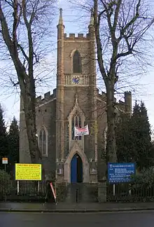 St James' Church, a brick gothic Commissioners' church designed by William Conrad Lochner, was consecrated in 1831[7] The first Anglican place of worship to be established in Enfield in addition to the parish church, St James' was built by subscription as a chapel of ease on land given by Woodham Connop. It was consecrated on 15 October by the Bishop of London, Charles Blomfield. A district was assigned to the church on 9 December 1833. It comprised the whole of the parish of east of a line drawn at a distance of 150 yards to the west of the main road from Edmonton to Cheshunt. The church was licensed for marriages in 1845.[8]