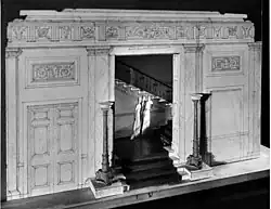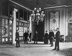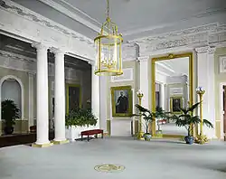 During the John F. Kennedy administration, the Entrance Hall (like most of the White House) underwent an extensive historic redecoration. The redecoration of the State Floor rooms, including the Entrance Hall, was overseen by American antiques autodidact Henry Francis du Pont and French interior designer Stéphane Boudin. Du Pont wanted a more historic approach to the White House, while Boudin preferred a French design aesthetic.[13] Du Pont originally redecorated the Entrance Hall with two French pier tables, a settee, a card table, and two tables by Charles-Honoré Lannuier. Boudin had all but the pier tables removed, and his style is the one which remained over the next several decades.[14]