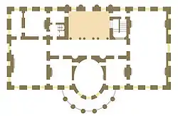 Architect James Hoban's original floor plans show a similar room, but with single columns separating the Entrance Hall and Cross Hall, and with the Grand Stair entering into the Cross Hall.[1] Mid-19th century photographs show the room as rebuilt by Hoban following the 1814 White House fire. In these photographs two Ionic columns support a series of shallow arches, and a frieze of bas-relief anthemion encircling the room. The shafts of Hoban's columns are recorded as being a blue marble.