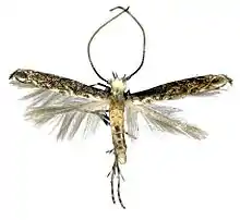 The length of the forewings is 5−7.5 mm. The forewings are greyish brown to dark brown, the markings dense and compact. There are three pairs of white striae from both the costal and dorsal 2⁄3, 1⁄2 and 3⁄4 extending obliquely outward to the middle and the end of the cell, as well as outside of the cell. The dorsal striae are broader and clearer than the costal striae and the basal 1⁄6 of the dorsum with a broad white band. There is a narrow silvery-white fascia with a metallic reflection from the costal 5⁄6 to the dorsum, arched outward medially. The distal 1⁄6 is ochre brown, with a central black dot edged by a short white streak or a dot near the costa, with a white band along the dorsum. The hindwings are greyish brown.