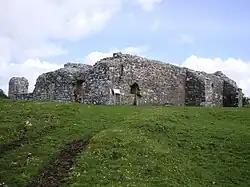 There is a long rectangular church, measuring 27 × 7 m (90' by 22') which has retained some trefoil-headed windows, two sedilia and a piscina. The east side of the cloister is well-preserved, but it does not have the typical open arcade.[5][6][7]