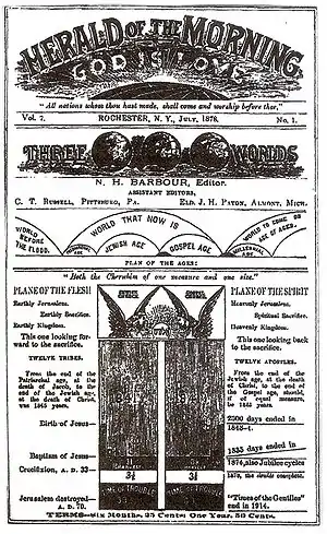 The Second Adventists affiliated with Nelson H. Barbour expected a visible and dramatic return of Christ in 1873,[56] and later in 1874.[57] They agreed with other Adventist groups that the "time of the end", also called the "last days", had started in 1799.[58] Soon after the 1874 disappointment, Barbour's group decided Christ had returned to the earth in 1874, but invisibly. Writing in his magazine The Herald of the Morning in 1875, Barbour outlined his eschatological views and connected the years 1874, 1878, 1881, and 1914. The "harvest" was to run from 1874 to the spring of 1878, concluding with "the translation of the living saints into the air."[5]