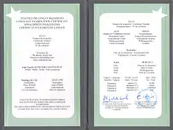 In addition to textbooks, including the Fundamento de Esperanto by Zamenhof, the Assimil-methods and the video-methods such as Muzzy in Gondoland of the BBC and Pasporto al la tuta mondo, there are many courses for learning online. Moreover, some universities teach Esperanto, and the Higher Foreign Language training (University Eötvös Loránd) delivers certificates in accordance with the Common European Framework of Reference for Languages (CEFR).[8] More than 1600 people have such a certificate around the world: in 2014 around 470 at the level of B1, 510 at the level of B2 and 700 for C1.[9] The International League of Esperanto Teachers (ILEI) is also working to publish learning materials for teachers.