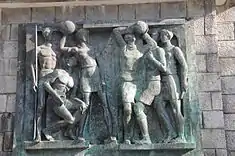 The oval plan includes four tall lampposts at the corners.[1] In the center, a rectangular football field circumscribed by athletics track with eight lanes, surrounded partly by benches arranged in four rows with eight steps each and rhythmical by openings that allow access from the outside. The west stand has, at the top center, rectangular glass tribune, surmounted by four masts and finished off in the front by the coat-of-arms of the city of Braga.[1] The main facade, facing the north, with rounded ends, doors on the first floor and rectangular windows on the second. In the center, is a wide two-story staircase with access to the main gate, bounded by rounded structures that integrate two sculpture panels in bronze, depicting sport with the inscription:[1]