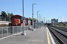 The station has 3 mainline tracks and a single platform serving only the northernmost track. A fourth track passes along the north side of the station, but it is only used for local freight access so it is fenced off from the platform.