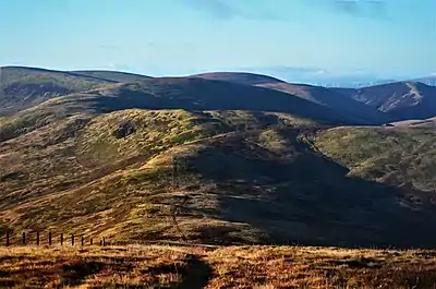 Not strictly defined, the hills form a lightly curving southwest–northeast shape and cover a considerable area. The Ettrick valley to the east separates them from the Craik Forest and the western border follows the A708 road. The large area west of Hawick, southwest of Selkirk and south of Yarrow Water could also be said to be part of the range as well as part of the historic Ettrick Forest.[1] The hills are relatively low-lying for the counties in which they lie, with the highest summit, Ettrick Pen, being 692m, however, unlike other nearby ranges, could be said to follow a definitive direction. The highest hills are on the western extremity of the area.