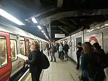 Between 1929 and 1931, the station buildings were reconstructed to a design by the MR's architect C. W. Clark.[19] A bridge was constructed above the tracks so that a single ticket office could be provided in place of the separate ones for each platform.[20] At the same time the station platforms were lengthened requiring the closure of Euston Road to enable the roadway and tunnels to be excavated as quickly as possible.[21] The brick arch of the tunnel roof and the side walls were removed and replaced with a flat roof on steel beams supported by concrete walls to the rear of the new platforms.[19]
