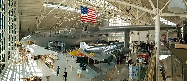 As of 2019, two exhibit centers are open to the public: The original structure is the aviation center with the Spruce Goose as centerpiece. Other aircraft, spanning the entire history of aviation, are arranged in the building, some parked under the wings of the Spruce Goose or suspended from the ceiling.