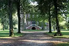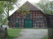 The first estate, Gut I, the so-called Sedelhof, lies east of the village street. It is bordered to the north and east by mill ditches, to the west by the millpond and to the south by the river Örtze. It is thus entirely surrounded by water and only accessible over a wooden bridge. Due to its good location it is thought to be one on the oldest estates in Eversen.[8] The estate was first mentioned in the records in 1424. In a deed of enfeoffment by the Duke of Lüneburg, a certain Carsten von Harling, amongst others, was enfeoffed a farm in Eversen. Because the enfeoffment was "from time immemorial" (von alters hero gehabt)[9] it can be assumed that Gut I had been in the possession of the Harling family from the end of the 14th century. The estate was one of the few in the Principality of Lüneburg that was furnished with a keep (Bergfried), or fortified tower. The present building dates from the year 1792, when the King's Council, Carl August von Harling, had a new manor house and stables built in timber-framed style.