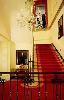 The northern third of what is now the State Dining Room was originally the western part of the Cross Hall. Two flights of stairs (one against the north wall, one against the south wall) led from the state floor to the second floor. A single, central stair then led up to the third floor.[64] Not completed when the White House was occupied in 1800, the Grand Stairs were probably finished by architect Benjamin Henry Latrobe in 1803 or shortly thereafter.[64] An extensive chimney breast was added to the fireplace in the room's west wall when it was reconstructed in 1817.[65]
