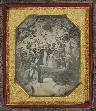 Of the six daguerreotypes of Douglass that have survived, only one besides Greenleaf's image has had its daguerreotypist identified. Greenleaf's image is unique because it is a group shot at an outdoor meeting rather than a studio portrait. Daguerreotypes were seldom attempted under these circumstances because the long exposure time required made it difficult to get a satisfactory result. Weld's is the only daguerreotype of Douglass whose date is known with certainty. This daguerreotype is also unique in the paradoxical sense that it is the only one known to have been copied. Two original half-plates exist: One is held by the Madison County Historical Society in Oneida, New York, the other is in a private collection and currently on display at the Smithsonian Institution in Washington, D.C. The copy (shown above) is in the J. Paul Getty Museum, Los Angeles, California.[1]