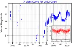 ![]() A visual band light curve of V832 Cygni. The main plot shows the long-term variability, and the inset plot shows the variation over a single orbital period. Adapted from Harmanec et al. (2002)[1] | |