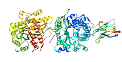 Similar to those of other endocrine FGFs, FGF21 receptor is a heterodimer, composed of an FGF receptor protein (FGFR) and a (β-) klotho co-receptor.[11] Klotho co-receptors of three types have been described (α, β and γ), all of which are sequentially related to β-glucuronidase, although being devoid of enzymic capacity.[52] FGF21 binds to FGFR through its amino terminus, and to β-klotho though its C-terminus.[53]
