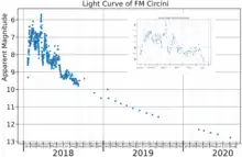 FM Circini's outburst and decline from peak brightness was observed by the Gaia spacecraft, the All Sky Automated Survey for SuperNovae and AAVSO observers.[5][6] The nova rose slowly to peak brightness, and then fluctuated between magnitude ~6.5 and ~8.5 for about three months, before beginning a nearly monotonic decline.[6] It took 150 days for FM Circini to fade from peak brightness by 2 magnitudes, which makes it a "slow" nova in the classification scheme of Cecilia Payne-Gaposchkin.[7]