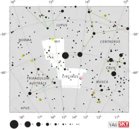 FM Circini, also known as Nova Circini 2018, was a nova which appeared in the constellation Circinus (near the boarder with Musca) in 2018. It was discovered by John Search of Chatsworth Island, New South Wales, Australia on 19.708 January 2018, using a DSLR with a 50 mm F/1.2 lens. At the time of its discovery, it had an apparent visual magnitude of 9.1.[1] It was confirmed to be a nova spectroscopically on 21 January 2018.[3] FM Circini reached a peak brightness of magnitude 5.8 on 22 March 2018, making it visible to the naked eye.[2]