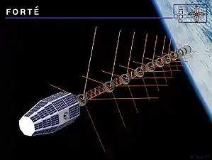 The Fast On-orbit Rapid Recording of Transient Events (FORTE, occasionally stylized as FORTÉ; COSPAR 1997-047A, SATCAT 24920) is a lightweight satellite[1] which was launched at about 8:30 AM on August 29, 1997[2] into a circular 800-kilometer (500 mi) low Earth orbit which is inclined 70 degrees relative to the Earth's equator,[3] using a Pegasus XL rocket. It was developed and launched by the Los Alamos National Laboratory in cooperation with Sandia National Laboratory, as a testbed for technologies applicable to U.S. nuclear detonation detection systems[2] used to monitor compliance with arms control treaties,[1] and later to study lightning from space.[4] The project was sponsored by the United States Department of Energy, and cost about US$35 million.[1] It utilizes optical sensors, RF sensors, and an "event classifier" in order to make observations, including monitoring Very High Frequency (VHF) lightning emissions in the ionosphere occurring from between 50 to 600 miles (80 to 966 km) above the surface of the Earth, and it will be a component of the VHF Global Lightning and Severe Storm Monitor (V-GLASS) system.[1][3] Its primary mission is to record and analyze bursts of RF energy rising from the surface of the Earth.[1] FORTE is 7-foot (2.1 m) tall, weighs 470-pound (210 kg), and is the first all-composite spacecraft, its framework being made entirely of graphite-reinforced epoxy. It consists of three decks with aluminum honeycomb cores, and composite facing to support the onboard instruments.[1]