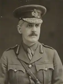 Ware met with the Adjutant-General to the Forces, Nevil Macready, in mid-February 1915 to discuss the future of his work.[49] With the support of Macready[10][50] the British Army formally recognised a Grave Registration Commission (GRC) on 2 March that was created from Ware's unit.[51] The Commission represented a joint effort between the British Army and the British Red Cross.[note 3][53] Ware initially divided the Commission into four regions with six men and four vehicles each, led by a headquarters of forty-four workers.[54][55] On 22 May he was made a temporary major in the British Army[56] to provide his work added authority.[57] On 9 September the promotion was antedated to 22 February 1915.[58]