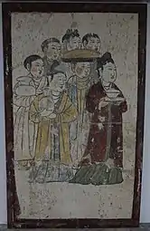 Mural painting from the Tomb of Zhang Kuangzheng (M10), Liao dynasty, 1058-1093 AD. Children and servants wear Khitan-style clothing and hairstyle; the standing women wears Han Chinese clothing. The hairstyle of the women is Khitan-style.[8]