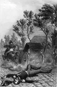 In 1842, the Duke was scheduled to leave for Saint-Omer to review part of the army of which he had been made the commander that was engaged at the Marne. He planned to travel from the Tuileries Palace to Neuilly-sur-Seine on 13 July 1842 to say goodbye to his family, and, for the sake of expediency, opted for an open carriage.[11] When the horses of his carriage ran out of control at Sablonville in the Hauts-de-Seine département; he lost his balance and fractured his skull, and, despite the best attentions of his doctors, the 31-year-old Duke died some hours later, surrounded by family members who had rushed to the scene.[11] Alfred de Musset evoked the accident in his poem Le Treize Juillet (in the collection Poésies nouvelles).