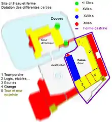 In the eighteenth century an additional wing was built that separates the yard from the front courtyard of the castle. The building thus became a "square farm", a traditional structure of farms in Condroz and Hesbaye.