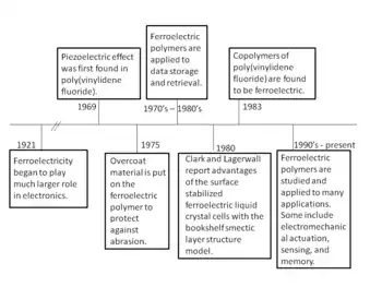 After the discovery of PVDF, many other polymers have been sought after that contain ferroelectric, piezoelectric, and pyroelectric properties. Initially different blends and copolymers of PVDF were discovered, such as a polyvinylidene fluoride with poly(methyl methacrylate).[2]