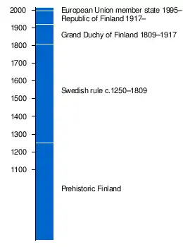 The history of Finland begins around 9,000 BC during the end of the last glacial period. Stone Age cultures were Kunda, Comb Ceramic, Corded Ware, Kiukainen, and Pöljä cultures. The Finnish Bronze Age started in approximately 1,500 BC and the Iron Age started in 500 BC and lasted until 1,300 AD. Finnish Iron Age cultures can be separated into Finnish proper, Tavastian and Karelian cultures.[1] The earliest written sources mentioning Finland start to appear from the 12th century onwards when the Catholic Church started to gain a foothold in Southwest Finland.[2]