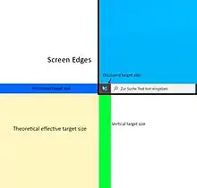 Placing layout elements on the four edges of the screen allows for infinitely large targets in one dimension and therefore presents ideal scenarios. Since the pointer will always stop at the edge, the user can move the mouse with the greatest possible speed and still hit the target. The target area is effectively infinitely long along the movement axis. Therefore, this guideline is called “Rule of the infinite edges”. The use of this rule can be seen for example in MacOS, which always places the menu bar on the top left edge of the screen instead of the current program's windowframe.[30]