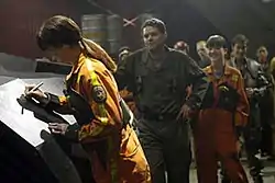 ![]() Crew members who worked on the Blackbird sign it as Chief Galen Tyrol looks on. | |