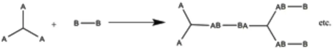 Gelation occurs when a polymer forms large interconnected polymer molecules through cross-linking.[1] In other words, polymer chains are cross-linked with other polymer chains to form an infinitely large molecule, interspersed with smaller complex molecules, shifting the polymer from a liquid to a network solid or gel phase. The Carothers equation is an effective method for calculating the degree of polymerization for stoichiometrically balanced reactions.[1] However, the Carothers equation is limited to branched systems, describing the degree of polymerization only at the onset of cross-linking. The Flory-Stockmayer Theory allows for the prediction of when gelation occurs using percent conversion of initial monomer and is not confined to cases of stoichiometric balance. Additionally, the Flory-Stockmayer Theory can be used to predict whether gelation is possible through analyzing the limiting reagent of the step-growth polymerization.[1]