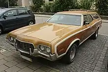 Torino Brougham models came standard with extra exterior and interior trim, finer upholsteries, wheel covers, unique emblems, extra sound insulation and "Hideaway" headlights. "Hideaway" headlights had headlight covers that were styled to look like the grille of the vehicle extended across the front end. When the lights were turned on, vacuum actuators would flip the covers up and out of the way to expose the quad headlamps. Motor Trend wrote that "when you get into a Brougham, it's the same feeling as an LTD, or even, dare we say it, a Continental. But in a more manageable scale."[16] Motor Trend gave accolades to the 1970 Torino Brougham 2-door for its quiet interior that only allowed "the muffled thump of freeway expansion-joints [to] intrude."[16]