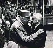 Prime Minister Winston Churchill and his top aides Foreign Minister Anthony Eden, and Chief of the Imperial General Staff General Alan Brooke in 1940-41 moved quickly to establish a base for de Gaulle in London.[1] Control of the overseas French Empire was seen as the central issue, In the British government was prepared to use military support to help de Gaulle regain control. De Gaulle set up a shadow government, including a French National Council and a Resistance movement inside both Vichy France and German-controlled France.[2] To establish his own leadership over like-minded Frenchmen, de Gaulle began broadcasting to France using BBC facilities.[3] De Gaulle was especially keen to set up a Resistance movement inside France,[4] However, many top British officials, as well as Roosevelt and sometimes even Churchill, still hoped for an understanding with Vichy France under Philippe Pétain. De Gaulle was totally opposed to any such relationship. Friction with Churchill's government continued to the end of 1942, centering around plans for the Anglo-American invasion of North Africa.[5] On that matter the United States played the dominant role. Roosevelt continued to recognize the Vichy government, with Ambassador William D. Leahy in residence in Vichy. The embassy was finally closed when Germany seized control of Vichy France in late 1942.[6][7]