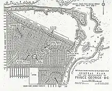 Properties were sold in both of the townsites with railway speculation driving up prices.[10] By 1913, South Fort George and Fort George each had a population of around 1,500 and were booming as thousands of rail construction workers came to town for supplies and entertainment.[14] Both communities believed that the Grand Trunk Pacific station would be built in their town, and both were disappointed when the railway purchased the 553 ha (1,366 acres) of land in between them from the Lhiedli T'enneh instead, even though Charles Vance Millar, then the owner of the BC Express Company, was well into negotiations to purchase that property himself.[15][9] The railway compensated Millar by giving him 81 ha (200 acres) of the property and, by 1914, when the railway was completed and the first train arrived, there were four major communities in the area: South Fort George, Fort George Townsite, the Millar Addition and the railway's townsite, Prince George, where the station was built.[9] Hammond also developed his lots further, including additions such as Central Fort George. Although George Hammond fought a series of bitter legal battles for a railway station in Fort George. The Railway argued against a station in Fort George as it was their investment and risk, thus they would build a station in a townsite of their own (Prince George).[10] Plans for the townsite for Prince George were created by Brett and Hall of Boston, and the land cleared in May 1913.[7]