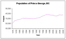 Prince George is a city in British Columbia, Canada, with a city population of 76,708[4] and a metro census agglomeration population of 89,490.[5] It is often called the province's "northern capital".[6] It is situated at the confluence of the Fraser and Nechako rivers.