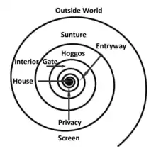 The interior of the suntuure, Zones 1-3 (internal gate, entryway, privacy screen, and residence) are reserved primarily for family members. It is in Zones 4 and 5 (the hoggo and suntuure living fence) where most activities of daily life occur. Here, visitors are greeted at a secondary shelter or pavilion, work on gardens (hoggos) is organized, children spend the day in play and work if of age, and afternoon prayers, naps, conversations, and meals occur until dark. Zone 6 is the outside world.