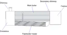 When the locomotive is started, cold water is fed directly into the main boiler which operates normally with the exhaust gases flowing out of the main chimney via the smokebox. Once the boiler is producing steam, the exit from the smokebox into the main chimney is closed and the exhaust gases instead flow through the feedwater heater and exit via the secondary chimney located towards the rear of the locomotive. Water fed into the boiler is now pre-heated in the feedwater heater and enters the boiler at higher than normal temperature.