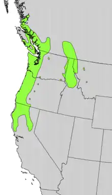 Cascara is native from northern California to British Columbia and east to the Rocky Mountains in Montana.[12] It is often found along streamsides in the mixed deciduous-coniferous forests of valleys, and in moist montane forests.[13] Cascara is common in the understory of bigleaf maple forest, alongside red osier dogwood and red alder.[14]
