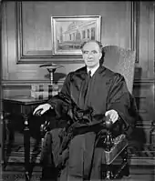 One year after becoming Attorney General, on January 4, 1940, Murphy was nominated by President Roosevelt as Associate Justice of the Supreme Court, filling the vacancy caused by the death of Pierce Butler the previous November. He was confirmed by the United States Senate on January 16,[30] and sworn in on February 5, 1940.[1] The timing of the appointment put Murphy on the cusp of the Charles Evans Hughes[31] and the Harlan Fiske Stone courts.[32] On the death of Chief Justice Stone, Murphy served in the court led by Frederick Moore Vinson, who was confirmed in 1946.[33] During World War II he served in the Army Reserve during three months of 1942 while the court was in recess.[34][35] He served as the executive officer to the Chief of Staff of the United States Army George C. Marshall.[36][37] He retired with the rank of Lieutenant Colonel.[35][34]