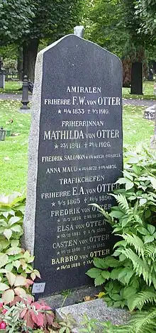 Otter was born on the Fimmersta[2] estate (Töreboda Municipality) in Västergötland and belonged to the wealthy and aristocratic von Otter family. He entered the Royal Swedish Navy as second lieutenant at the age of 17, but remained without promotion for a long time. Meanwhile, he served in the British Royal Navy from 1857 to 1861, participating in campaigns against pirates in the South China Sea, and took part in one of Adolf Erik Nordenskiöld's North Pole expeditions in 1868, as commander of the expedition ship Sofia.[2] He was promoted to commander and made aide-de-camp of Crown Prince Oscar, the Duke of Östergötland, in 1872 and remained so after the prince's accession to the throne as Oscar II in 1873.