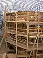 Plans of a sister ship, Concorde, were used. The cost was estimated to be $22 million.[2] The original plans had been modified in several ways for reasons of strength and safety: planks had been bolted rather than pegged to avoid movement during the long period of construction. Similarly, the mast sections were fastened with glue rather than metal hoops to avoid water penetration. The cannons are lightweight and non-functional to save weight. Manilla rope has been used for the majority of the rigging and the sails made of linen canvas.