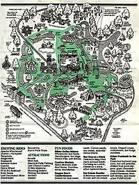 | Ferris Wheel | Eli Bridge | "Big Eli" Ferris Wheel | 1965 | 1980 | 12 seats, 42 ft (13 m) tall.[1]: 32 Sold to Santa's Village (Sky Forest) in 1980 after park's closure.[61] |
